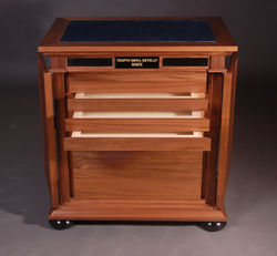 Made from black walnut and ebony this cabinet was made to house a collection of drawings and documents. The top slides open to reveal a display area lined with silk velvet.